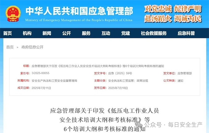 7月18日,应急管理部印发了低压电工、高压电工、熔化焊接与热切割、压力焊、登高架设以及高处安装、维护、拆除作业人员安全技术培训大纲和考核标准等6个培训大纲和考核标准。